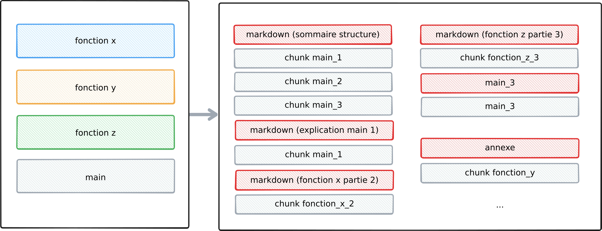 You can write arbitrary incomplete code in code chunks, and compose code chunks freely. This, I believe, is the true spirit of literate programming, but is often overlooked by software authors who implement software products using the idea of literate programming. Literate programming is a programming technique. It does not simply mean mixing code and text in a linear order. « The First Notebook War - Yihui Xie 谢益辉 » (s. d.)